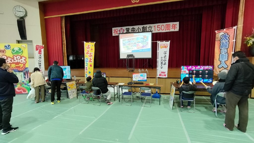 スタートはゆっくりな感じで、ご家族で楽しんでもらいました。お昼を迎えるころには箕曲小学校の小学生が集まってきて、みんなでぷよぷよeスポーツと太鼓の達人を代わりばんこに楽しんでいました。特にぷよぷよeスポーツをやったことがある人が多く、友達同士で対戦を挑んだりしていました。