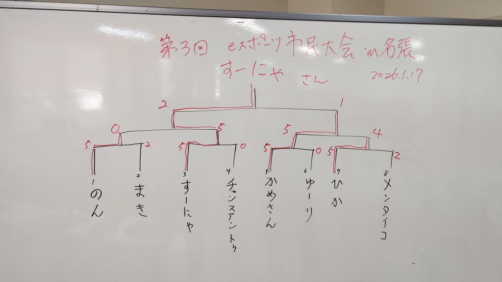 決勝はすーにゃ選手とかめさん選手になりました。1セット目をかめさん選手がとるも、2セット目を5-0で取ったすーにゃ選手が勢いのまま3セット目も取って優勝!おめでとうございます!